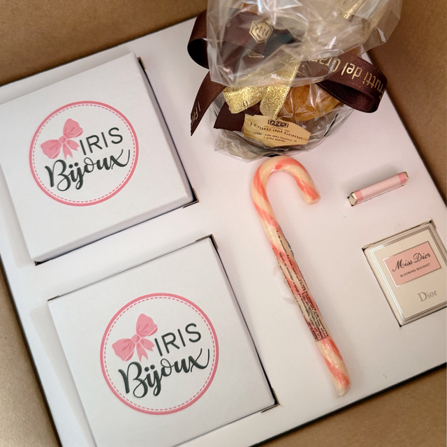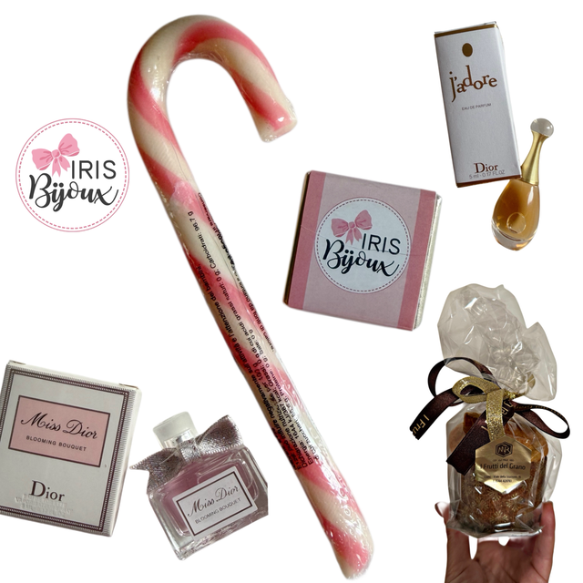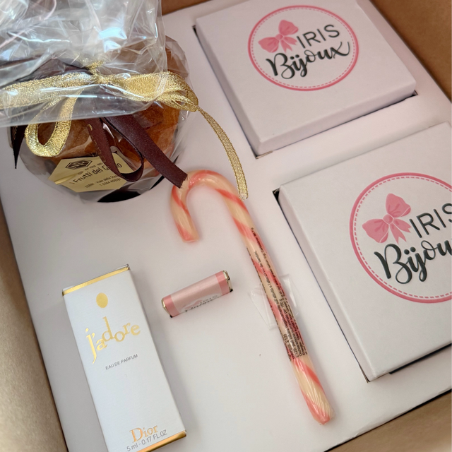 Oltre a queste due creazioni contenute in delle scatoline create appositamente per questa box (e che non troverete più se non in questa occasione),ci sono un cioccolatino personalizzato Irisbijoux, un candycane rigorosamente rosa ed un panettoncino da 100gr artigianale, nato dalla collaborazione con i frutti del grano. Nella box Gold, una miniatura J’adore di Dior, mentre nella Silver, una miniatura di Miss Dior.